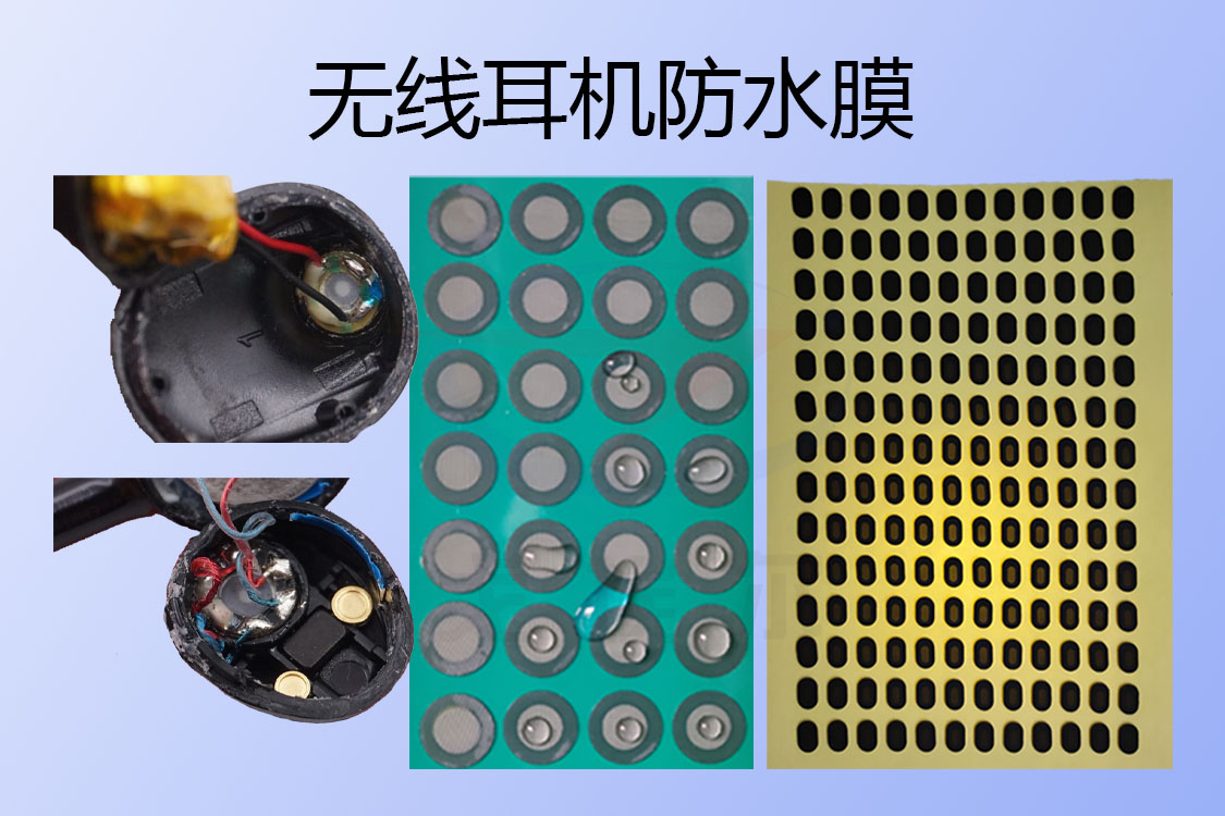 現在的耳機防水大部分是從兩方面入手的,一是上下殼體間連接通過防水密封膠點膠加工來實現的,二是在無線耳機的透聲孔與透氣孔采用戈埃爾無線耳機防水膜(無線耳機防水透聲膜或者是聲學無線耳機防水透氣膜)來實現防塵防水防護,并且還具有一定的透聲與透氣能力,根據所用的無線耳機防水膜材料,防護等級達到IP67甚至是IP68,IP67防水等級耳機在無線耳機防水膜保護下可在1米水深30分鐘內不進水,無線耳機防水膜(無線耳機防水透聲膜或者是聲學無線耳機防水透氣膜)通過粘性很好的背膠粘附在密封殼體上,來保護內部的敏感揚聲器、麥克風和受話器不受水、灰塵、污垢和雜質影響,同時保證在低音損的前提下使得聲音清晰自然!